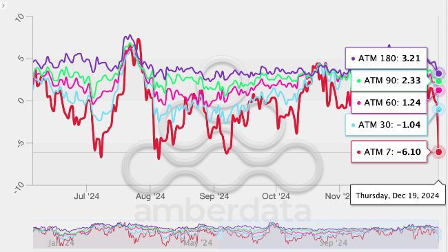 يظهر انحياز الخيارات السبعة أيام للبيتكوين إلى أن الخيارات المدرجة في Deribit والتي توفر حماية من الهبوط وتنتهي في أسبوع تتداول بعلاوة تذبذب ضمني أعلى للخيارات منذ سبتمبر، وفقًا لمصدر البيانات Amberdata. ببساطة، الخيارات أصبحت الأكثر تكلفة بالنسبة للخيارات في الثلاثة أشهر الماضية.
