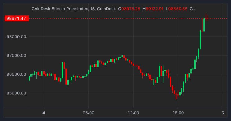 بعد تراجع طفيف إلى ما دون 95,000 دولار في منتصف اليوم، قفزت البيتكوين لاحقًا بنسبة تقارب 5% لتصل إلى أعلى سعر لها خلال الجلسة عند 99,177 دولارًا، وفقًا لبيانات CoinDesk. وكانت أكبر عملة رقمية من حيث القيمة السوقية قد ارتفعت بنسبة 3.2% خلال الـ 24 ساعة الماضية، متفوقةً على المؤشر الأوسع لسوق الأصول الرقمية CoinDesk 20 الذي شهد زيادة قدرها 1.3%.