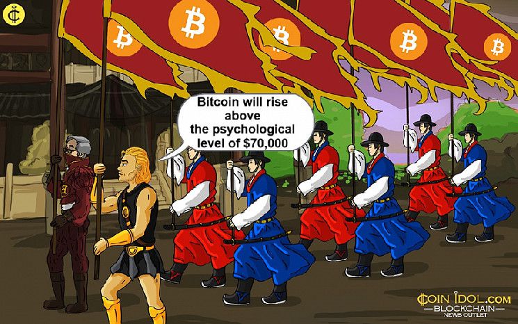 على الرسم البياني لكل أربع ساعات، تقوم البيتكوين بإعادة اختبار أعلى مستوياتها عند 70,000 دولار بعد اختراق الحاجز الحالي. الآن، بعد الوصول إلى المستوى السعري المستهدف، حافظ المشترون على زخم إيجابي فوق الارتفاع عند 70,000 دولار. إذا نجح المشترون، ستعود البيتكوين إلى ارتفاعاتها السابقة عند 71,750 و73,000 دولار. أفاد Coinidol.com الأسبوع الماضي أن البيتكوين كانت تحوم فوق مستوى الدعم الحرج عند 65,000 دولار ولكن تحت الارتفاع عند 67,000 دولار.