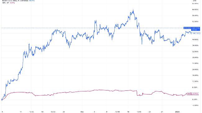 في الفترة الأخيرة، بدأ البيتكوين وS&P 500 في التحرك معًا مرة أخرى، حيث وصلت الارتباط بينهما إلى 0.88 (مع 0 لعدم وجود ارتباط و1 لارتباط مطلق) وفقًا للمتوسط المتحرك لآخر 20 يومًا.