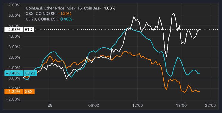 حققت إيثريوم، ثاني أكبر عملة مشفرة في السوق، مكاسب تزيد عن 4% خلال الـ 24 ساعة الماضية، في حين فقدت بيتكوين 1.5% خلال نفس الفترة، متراجعة إلى ما دون 95,000 دولار خلال جلسة الاثنين. تفوقت إيثريوم حتى على مؤشر السوق الشامل CoinDesk 20، الذي ارتفع بنسبة 0.5%.