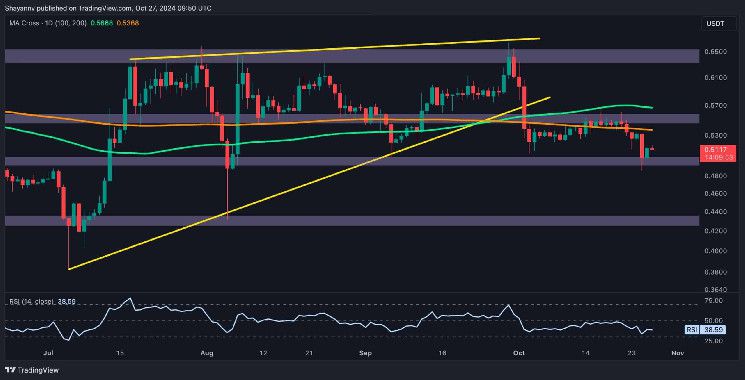 منطقة الدعم عند 0.5 دولار تعتبر قاعدة صلبة قد تبطئ من الزخم الهبوطي وتجذب اهتمام الشراء، مما سيساعد في التماسك قبل الحركة التالية.