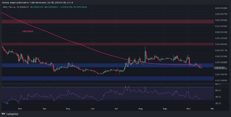 يعكس زوج XRP/BTC نفس الاتجاه السلبي، حيث يخترق مستويات دعم هامة وقد ينخفض أكثر إذا لم يستعد السوق المتوسط المتحرك لـ 200 يوم.