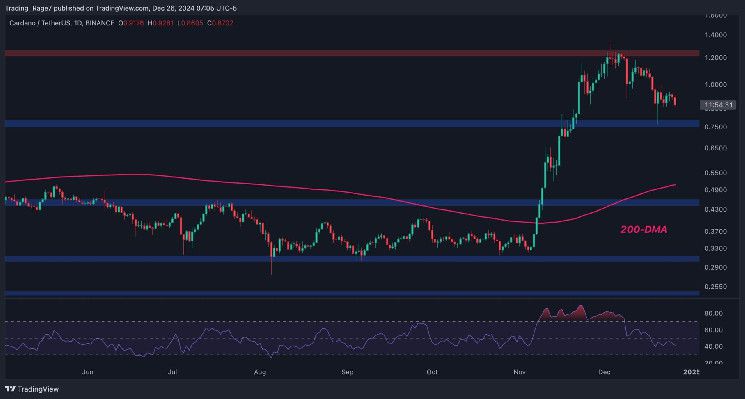 يشهد كاردانو حاليًا تراجعًا مشابهًا لبيتكوين، حيث يظهر تصحيحًا على مستوى الرسوم البيانية مقابل USDT و BTC. - هل هناك فرص لارتفاع كاردانو فوق حاجز 1.2 دولار؟